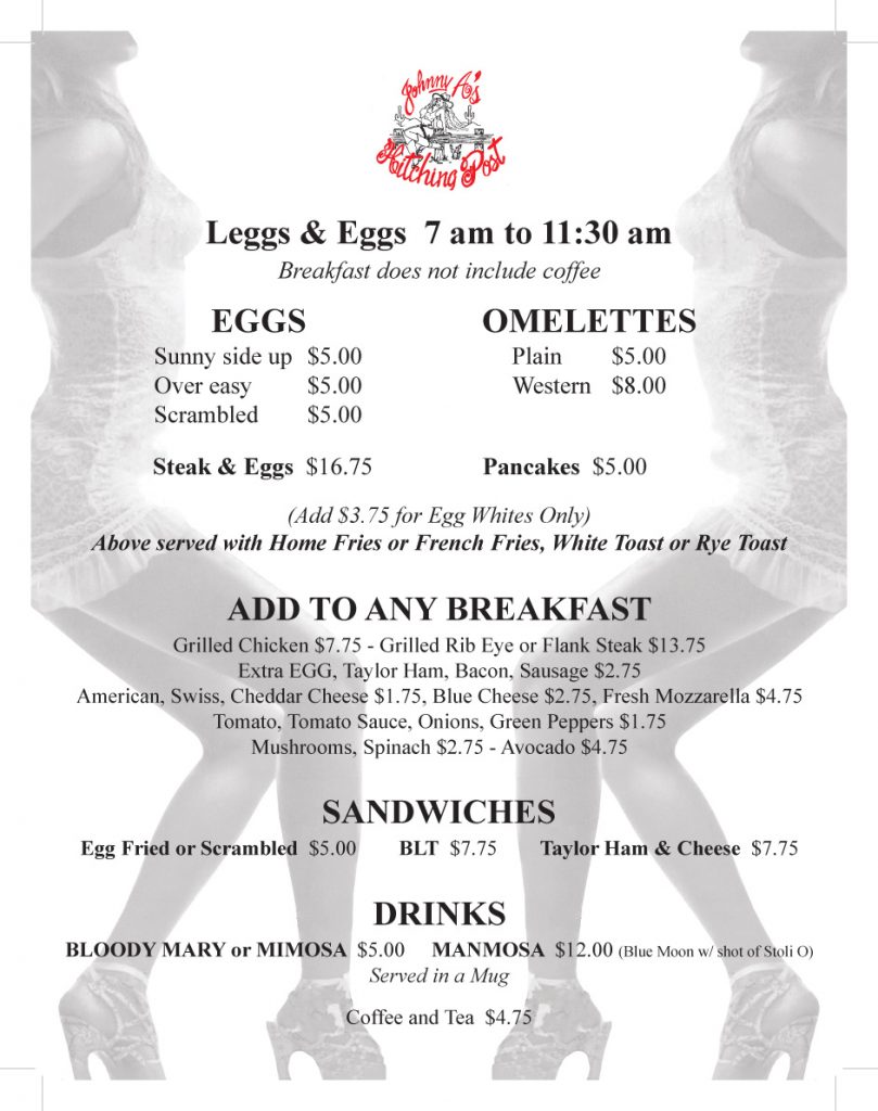 Open 7 Days a week at 11:30 am close at 2:30 am. Friday Leggs and Eggs open at 7:00am!